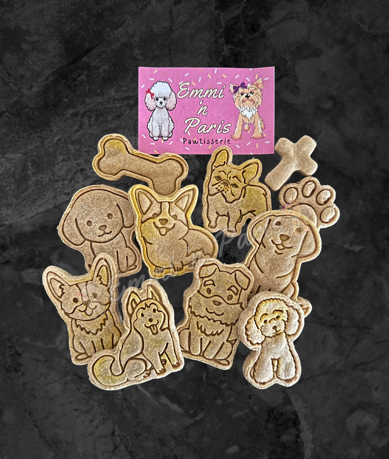 Animal Cookies for Dogs! Nutritious, organic ingredients, human-grade, non-GMO. No preservatives, dyes, or sugar. Nothing artificial. Choose flavor Carrot/Apple – ground oats, carrots, apples, eggs. Peanut Butter – ground oats, pureed peanuts, water. Pumpkin/Carrot – ground oats, pumpkin, carrots, eggs.