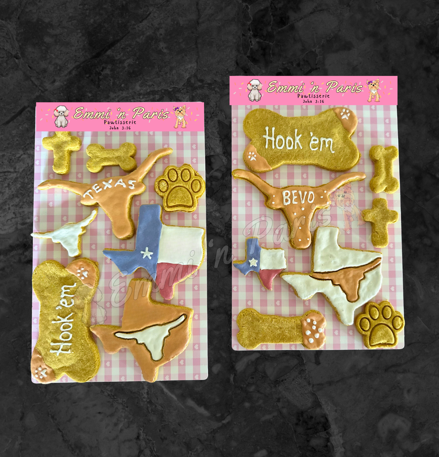 Texas and Longhorn cookies! Your pup will “Yee Howl” Nutritious, organic ingredients, human-grade, non-GMO. No preservatives, dyes, or sugar. Nothing artificial. Choose flavor and iced or un-iced. Carrot/Apple – oats, carrots, apples, eggs. Pumpkin/Carrot – oats, pumpkin, carrots, eggs. Peanut Butter – ground oats, pureed peanuts, eggs, water. Icing – yogurt powder, tapioca powder, vegetable and fruit powders.